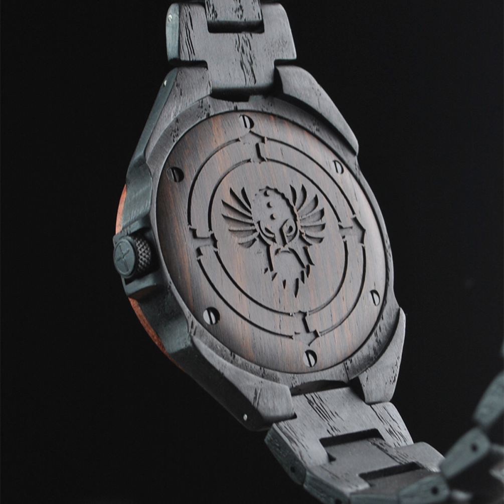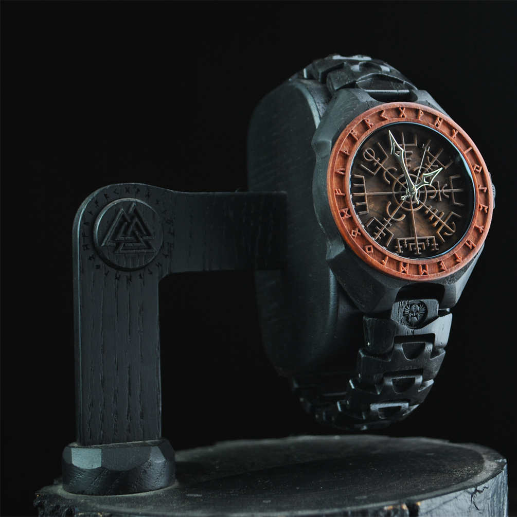 Dieser Artikel ist komplett von Hand aus 1500 bis 2000 Jahre altem Mooreichenholz, Walnussmaserholz sowie Palisander Santos gefertigt, enthält unser Branding auf dem Armband und ein spezielles geschnitztes Holzetui mit einer besonderen Figur aus der nordischen Geschichte.