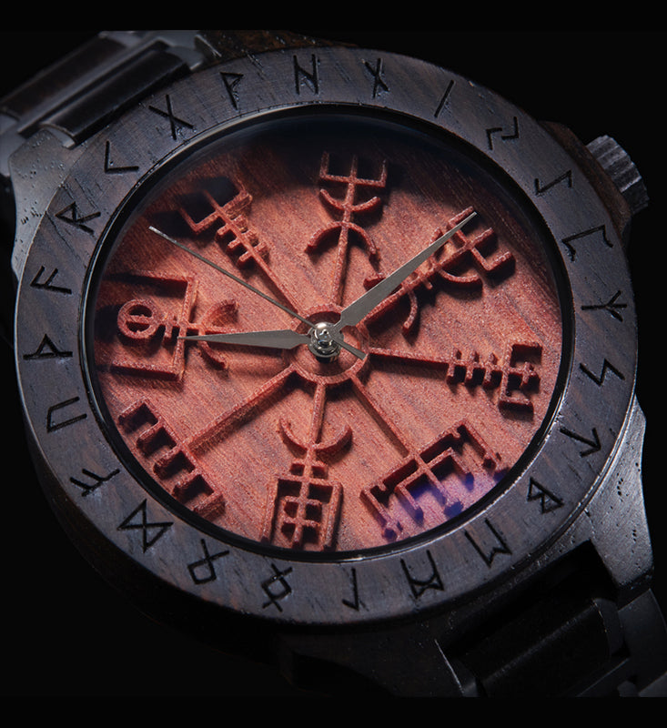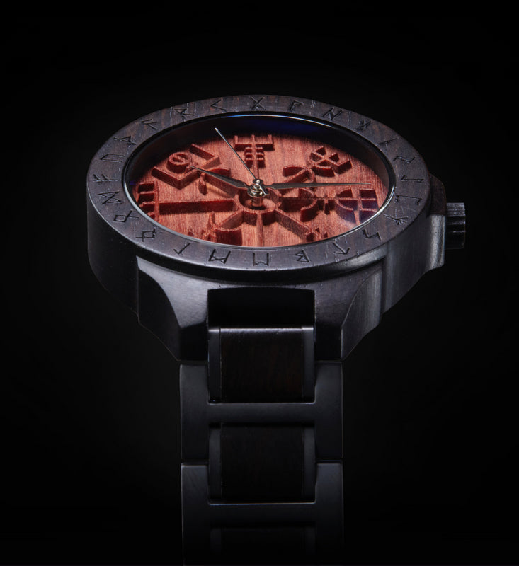 In der skandinavischen und isländischen Folklore soll dieses Symbol den Träger durch raues Wetter führen und im Idealfall dafür sorgen, dass man sich nicht verirrt. Das Zifferblatt ist komplett von Hand aus gealtertem Mahagoni gefertigt.