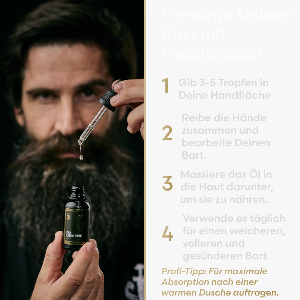Unser Day Liquid Tonic Bartöl versorgt deine Haut mit Feuchtigkeit und schützt deinen Bart. Unser Day Liquid Tonic Bartöl ist ein einzigartige Produkt enthält natürliche Öle, die Ihrem Bart Geschmeidigkeit verleihen und ihn vor Haarbruch, Stumpfheit sowie trockener Haut und mehr schützen... Außerdem ist es frei von bekannten DHT-Hemmern, was es zu einer guten Wahl für Menschen mit empfindlicher Haut macht. Und schließlich sorgen die luxuriösen Düfte in Cologne-Qualität dafür, dass du dich den ganzen Tag erfrischt und belebt fühlen. Warum also warten? Teste unser flüssiges Tageselixier noch heute!