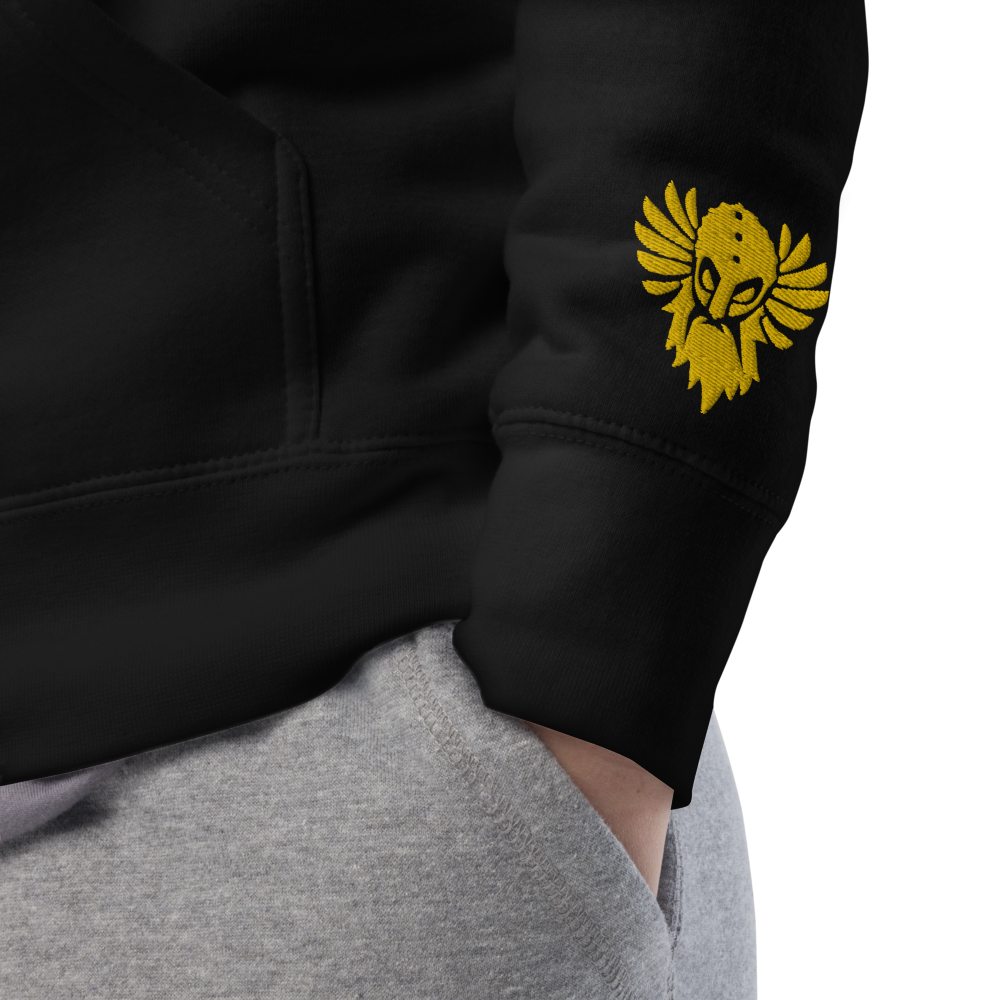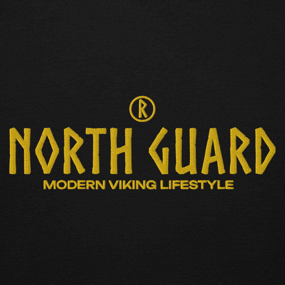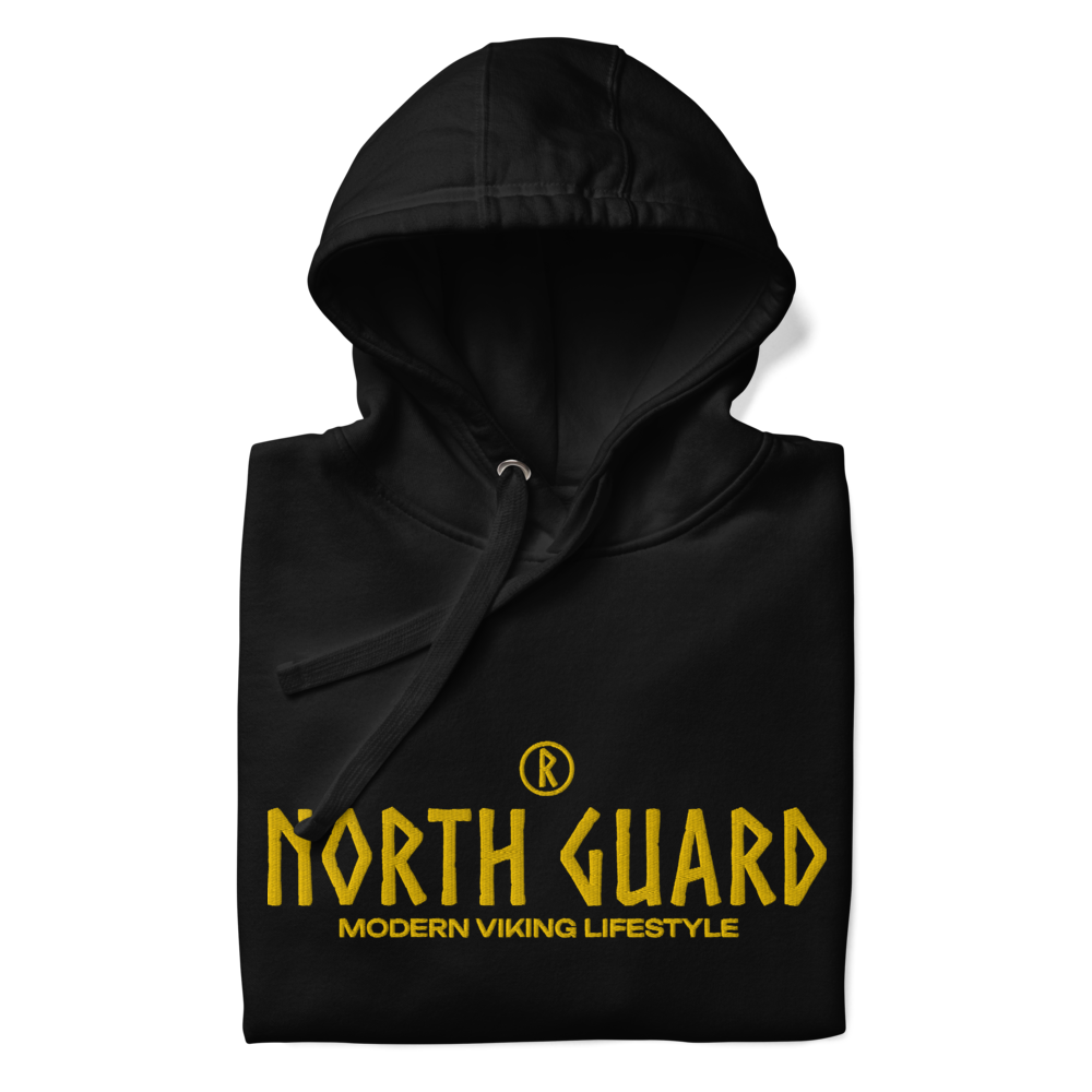 Schwarzer Fashion Hoodie aus 65 % ringgesponnene Baumwolle und 35 % Polyester mit einem goldgestickten Schriftzug in 3D. Auf dem linken Ärmel ist das NORTH GUARD Logo ebenfalls in Gold aufgestickt. Mit unserer Marke trägst du die Stärke der Wikinger! „Show your strength - Show your fashion!“