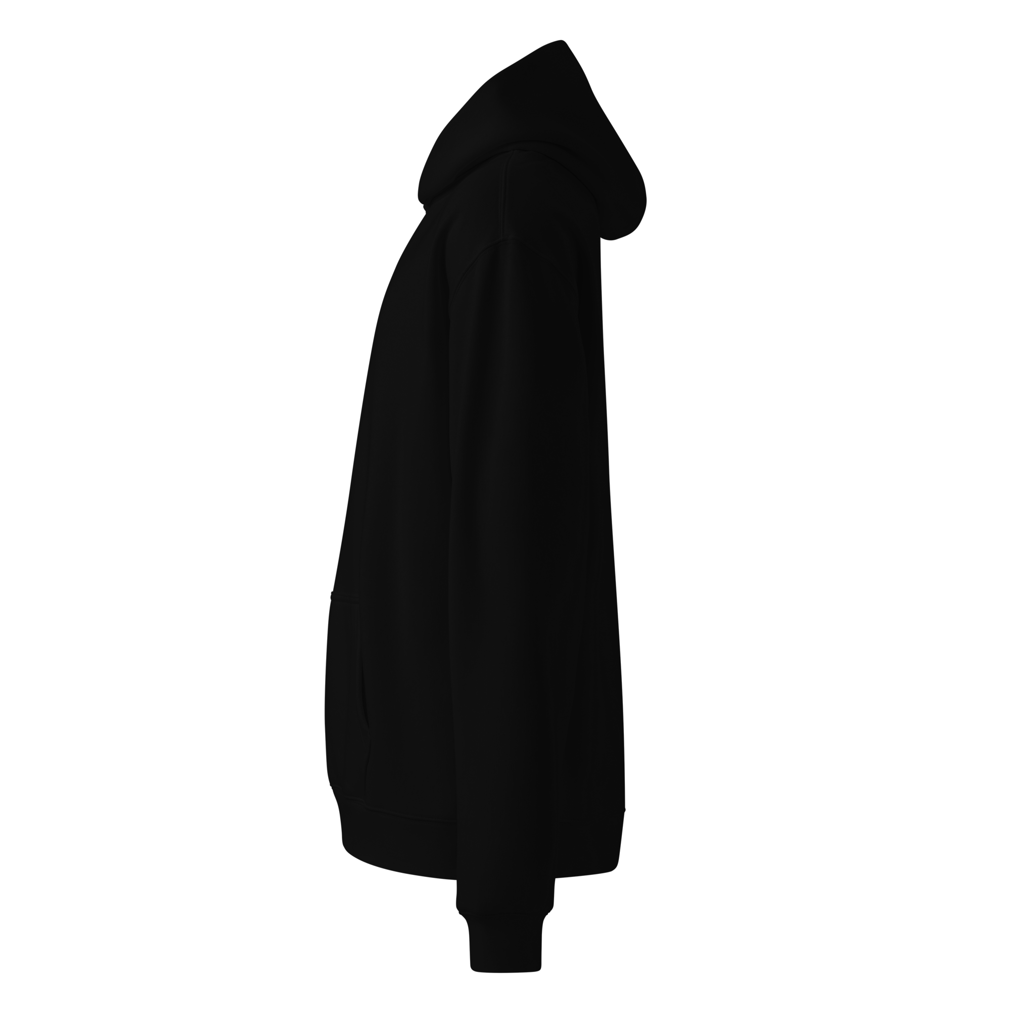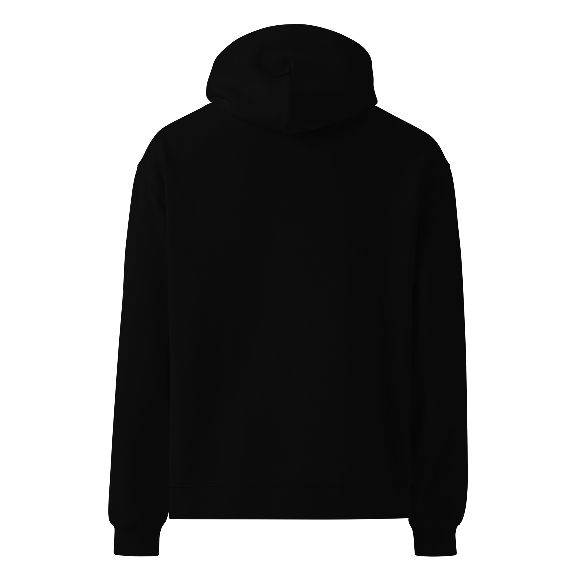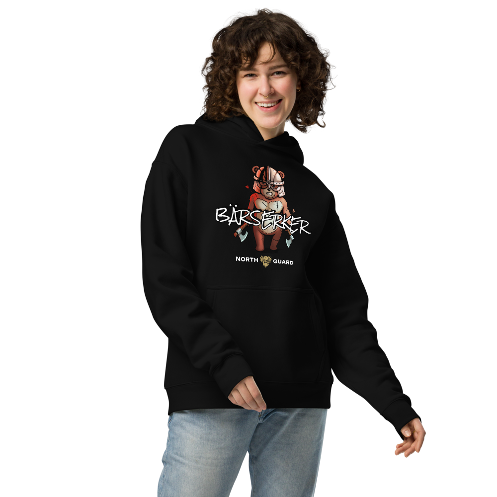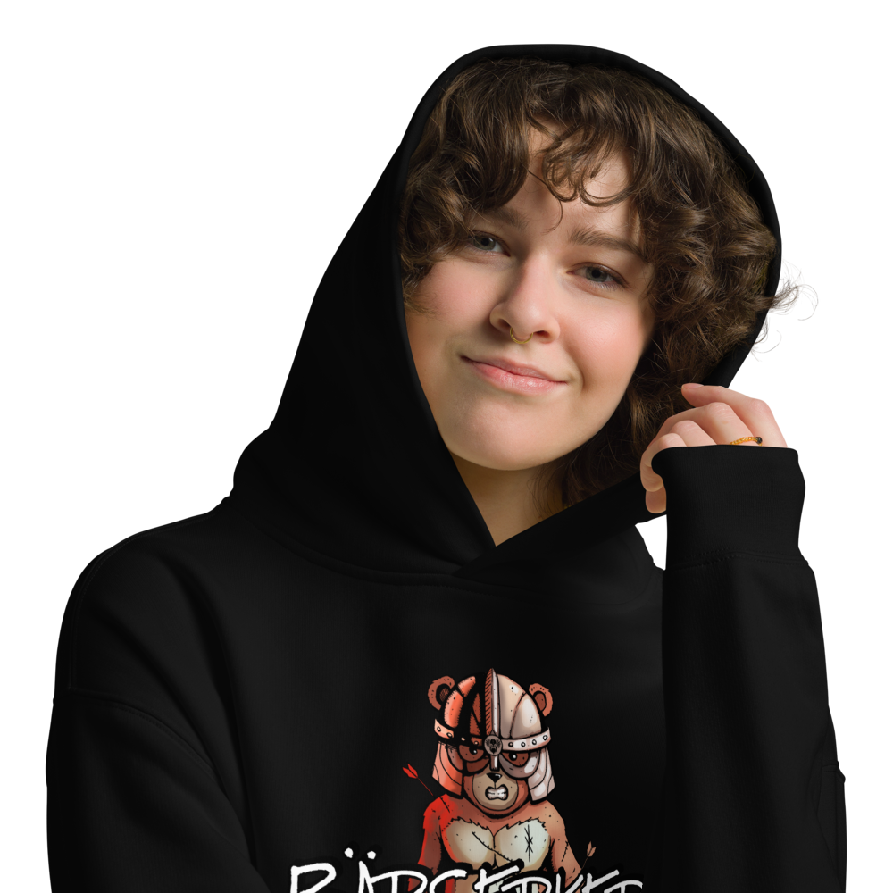 Schwarzer Unisex Oversized-Hoodie aus 80 % Baumwolle, 20 % recyceltes Polyesterfleece mit dem Bärserker-Aufdruck. Mit unserer Marke trägst du die Stärke der Wikinger! „Show your strength - Show your fashion!“