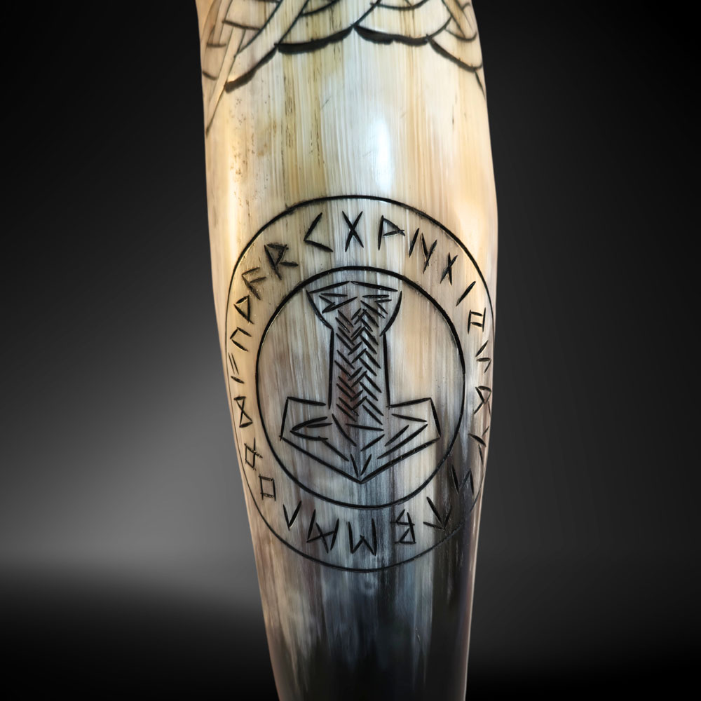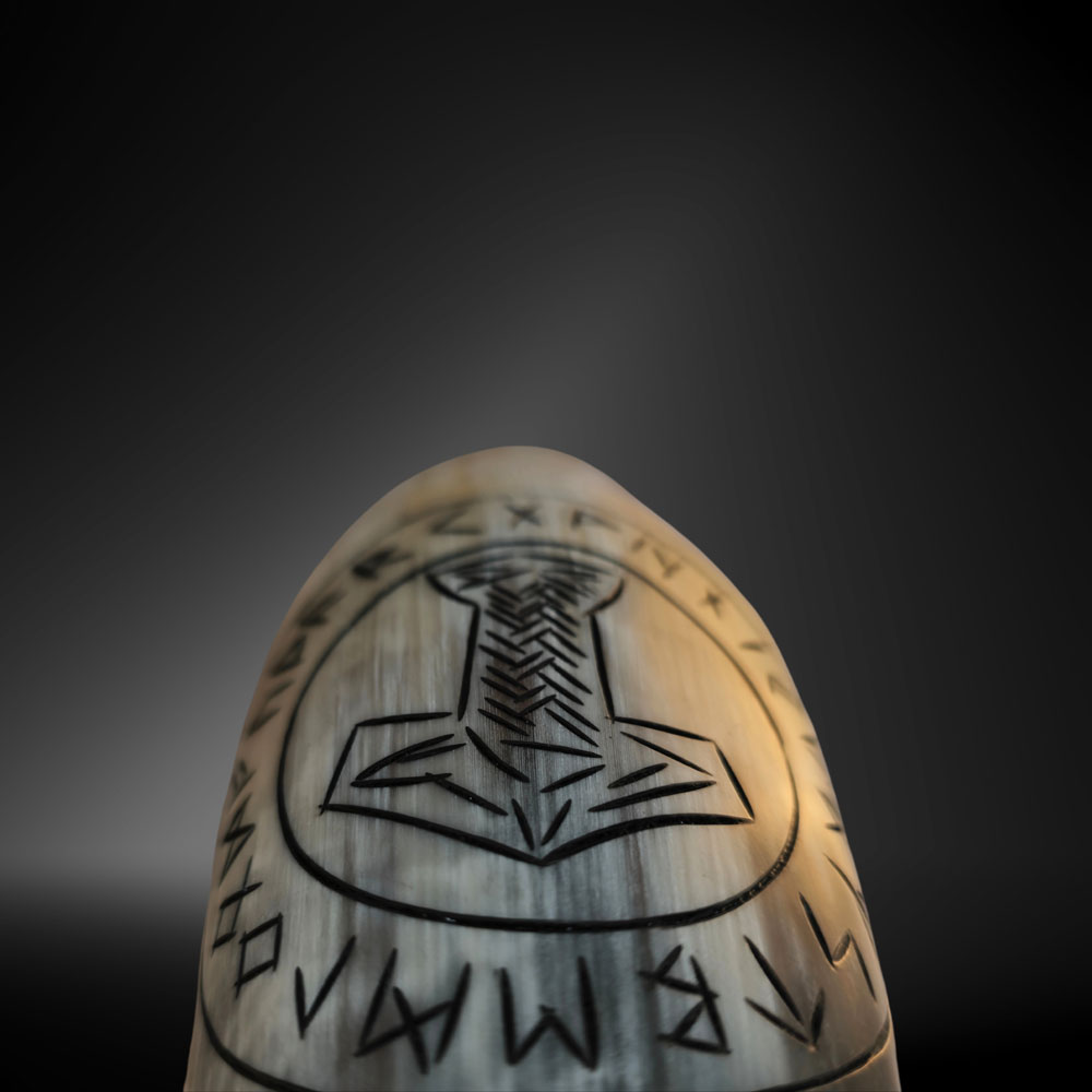 Zusätzlich zu seiner ansprechenden Optik ist das Horn mit kunstvollen Gravuren versehen, die seine Geschichte und Herkunft erzählen. Mit einem Fassungsvermögen von 0,5 Litern bietet es ausreichend Platz für deine Lieblingsgetränke.