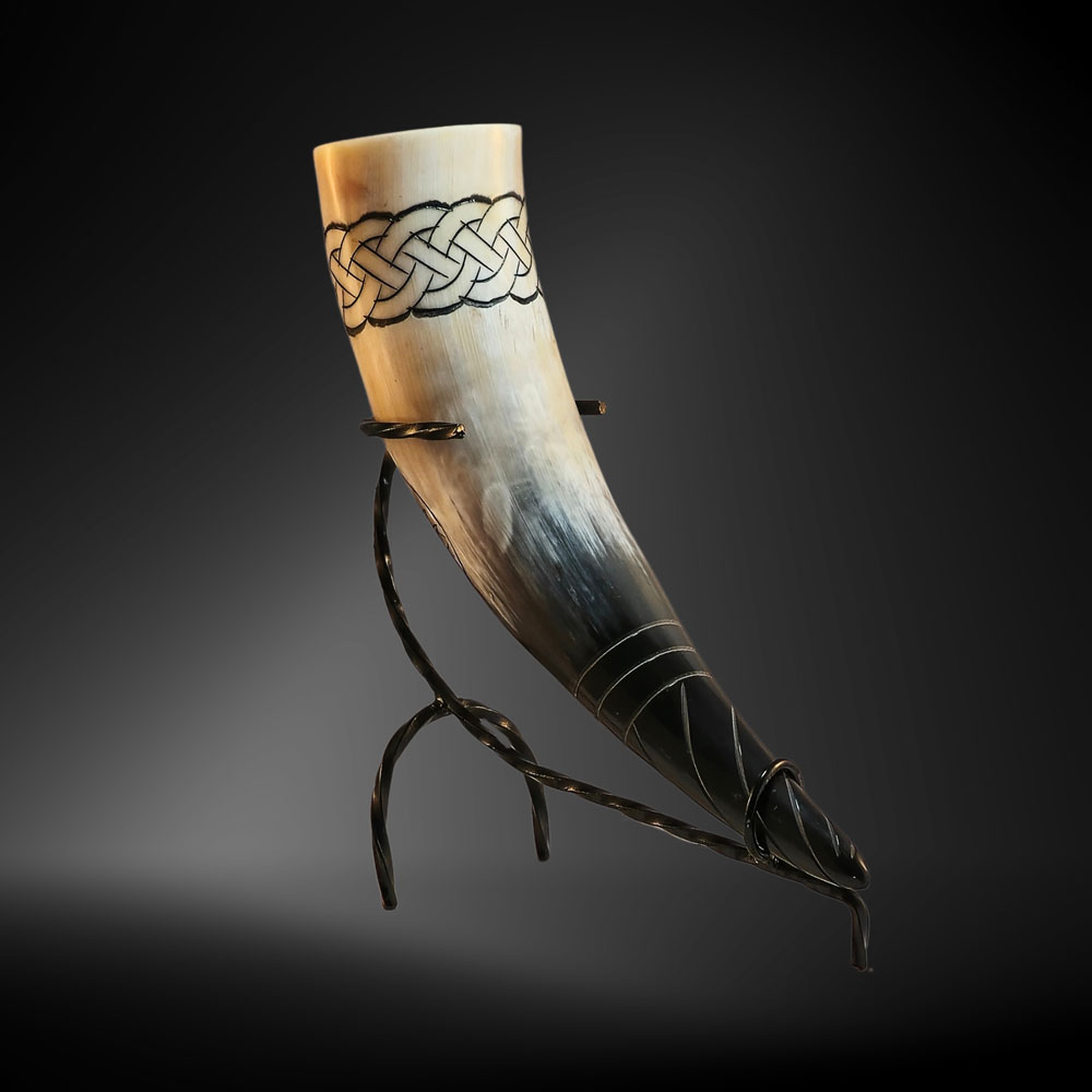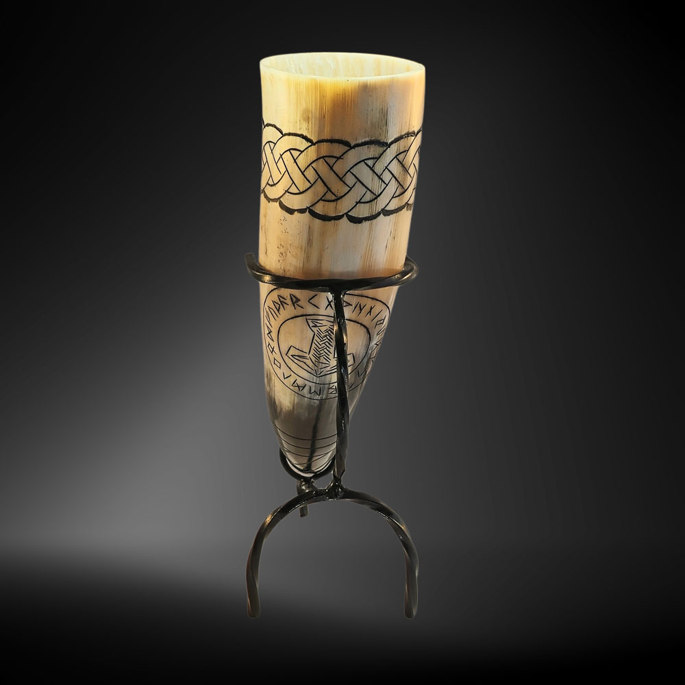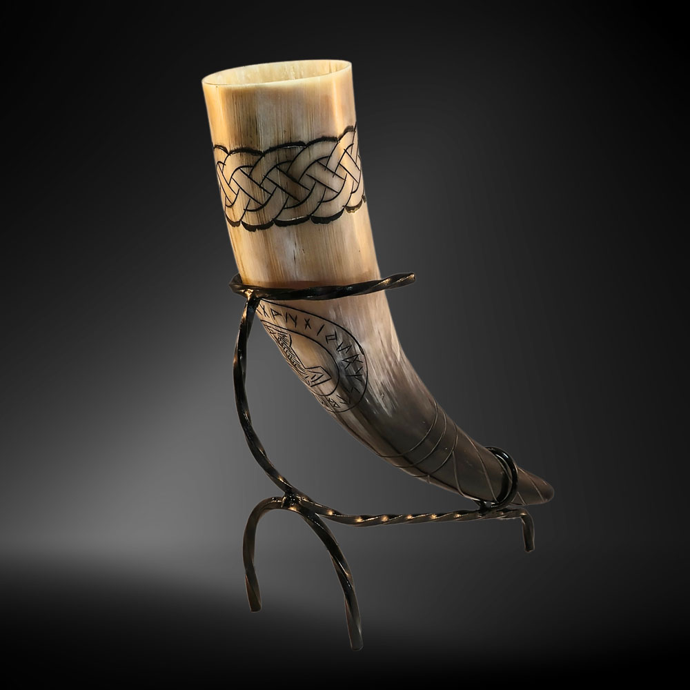 Der mitgelieferte Ständer aus Schmiedeeisen präsentiert das Trinkhorn majestätisch und bietet zugleich eine praktische Aufbewahrungsmöglichkeit. Ein harmonisches Zusammenspiel von Tradition und Funktionalität.